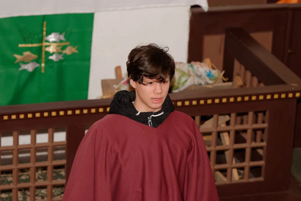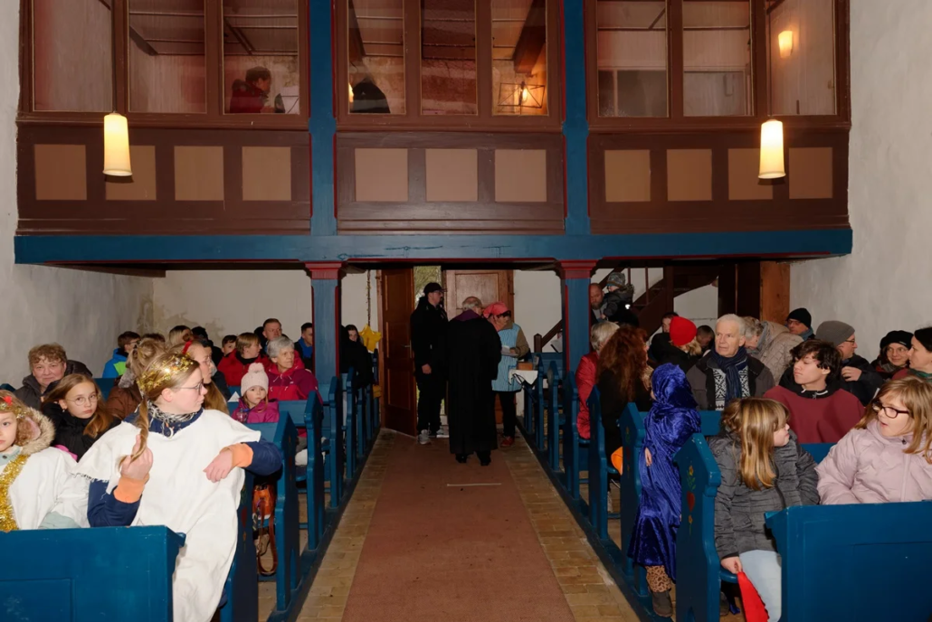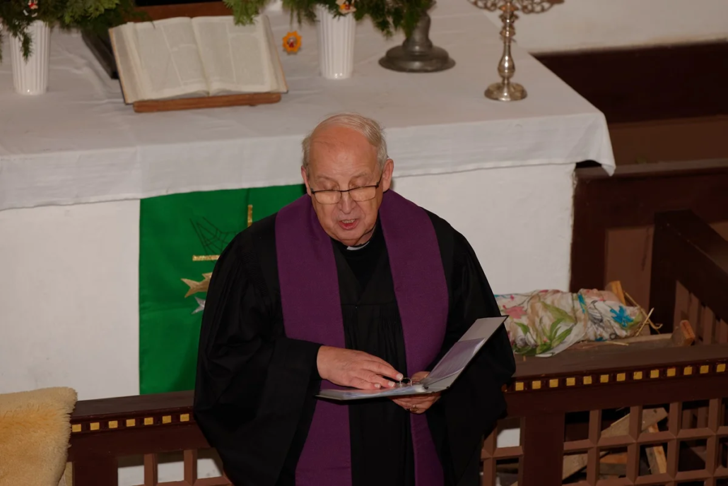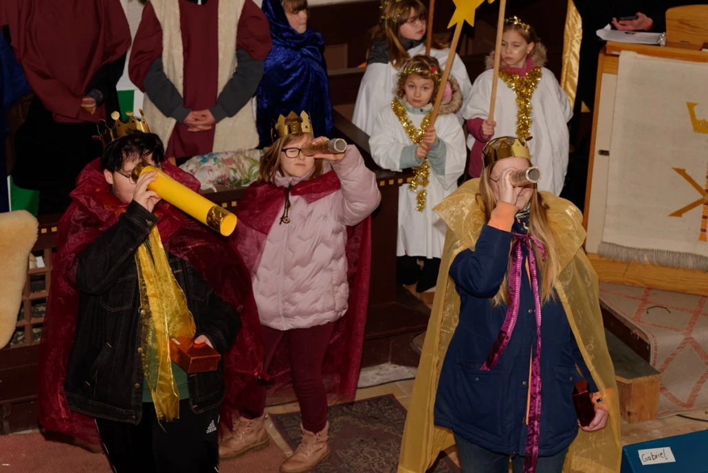 In seiner Predigt nahm Burkhard Fröhlich die Gemeinde mit auf eine Reise zurück in die Zeit vor rund 2025 Jahren und stellte die Frage, was damals im kleinen Ort Bethlehem eigentlich geschehen ist. Er machte anhand der aktuellen Geschichte deutlich, welche klare Botschaft das Weihnachtsfest verkündet: Liebe verändert die Welt. Anschließend übergab er das Wort an Gemeindepädagogin Kathrin Schulz, die das traditionelle Krippenspiel zur Geburt Jesu Christi ankündigte.
