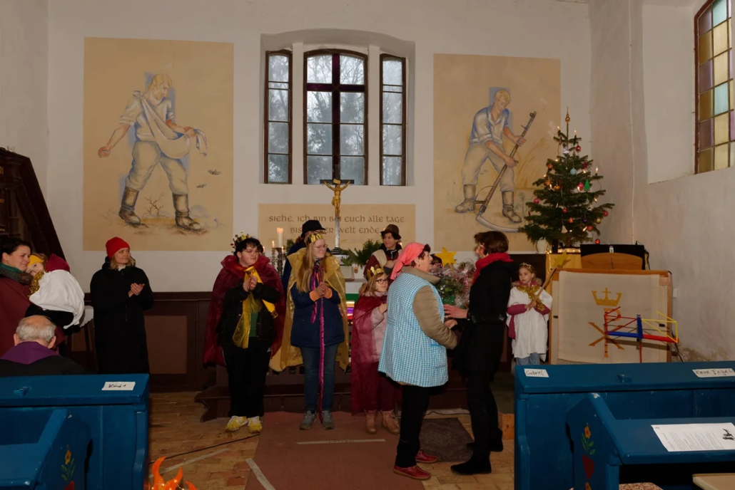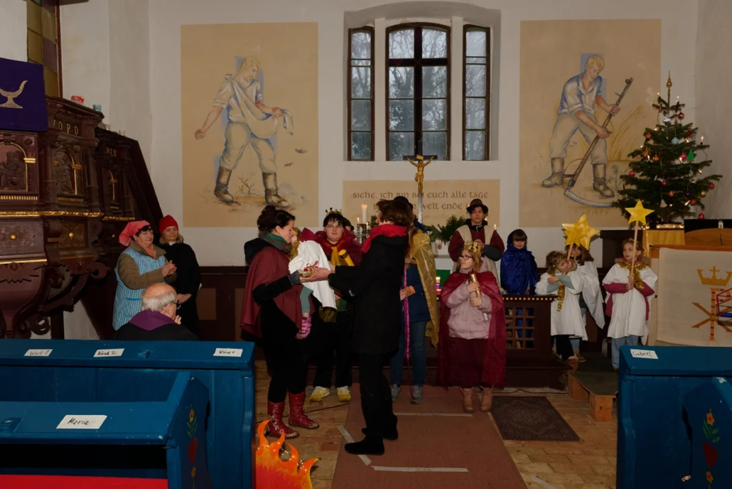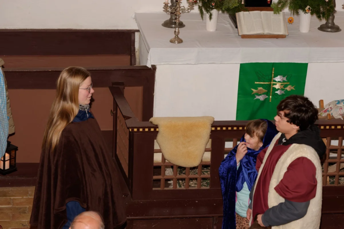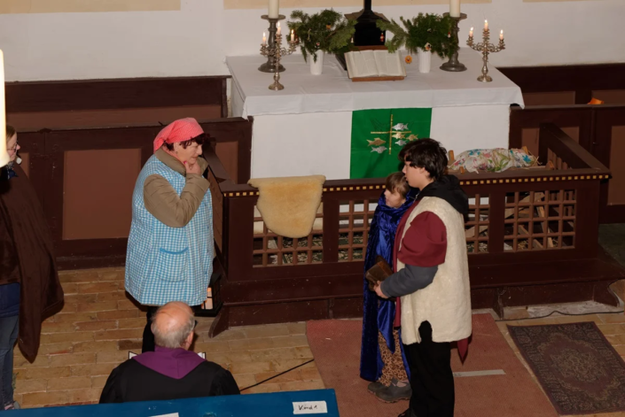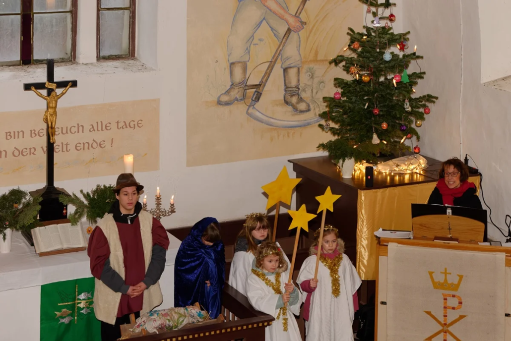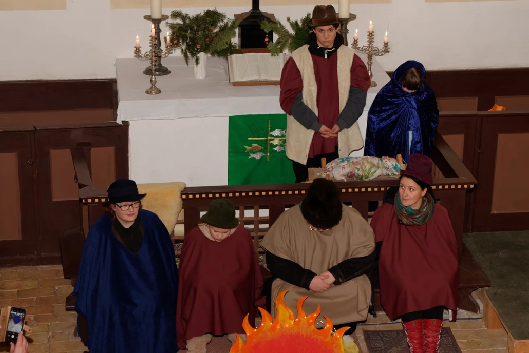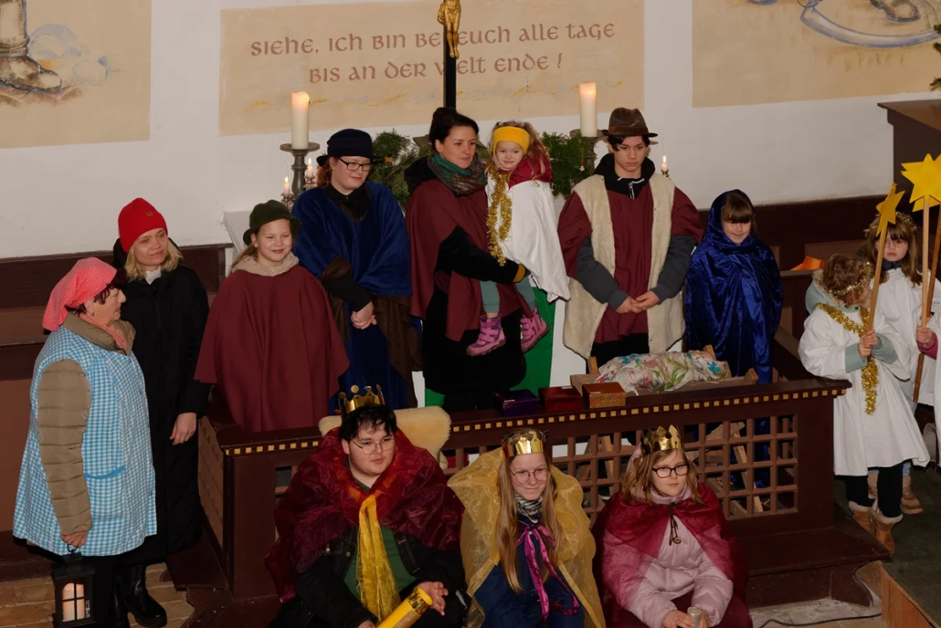 Wie in den vergangenen Jahren standen Menschen aller Generationen gemeinsam auf der „Bühne“. Mit viel Freude und Engagement gestalteten Diana, Lucy, Anna, Amelie, Rosi, Lucas, Carolin, Heike, Emilia, Cosima, Fynn und Josi das Krippenspiel.