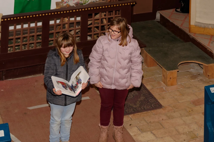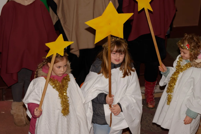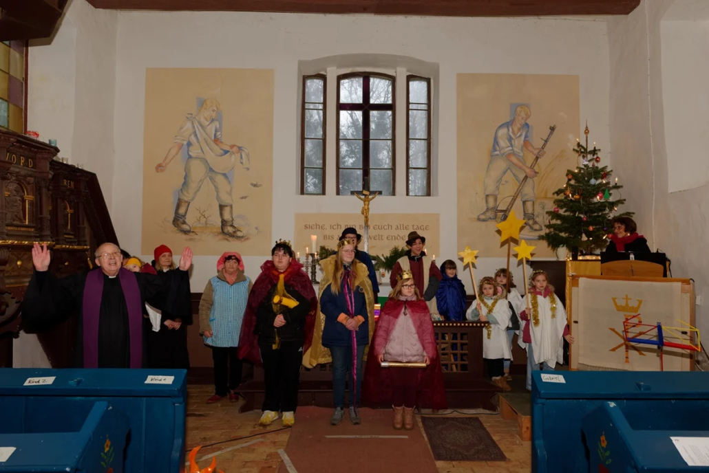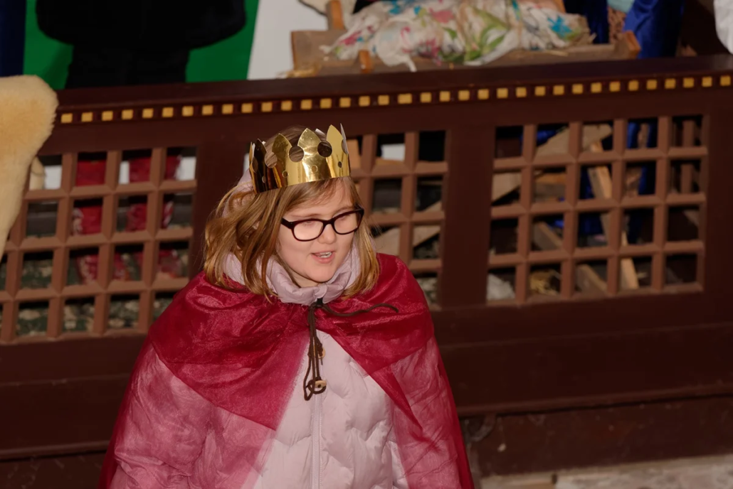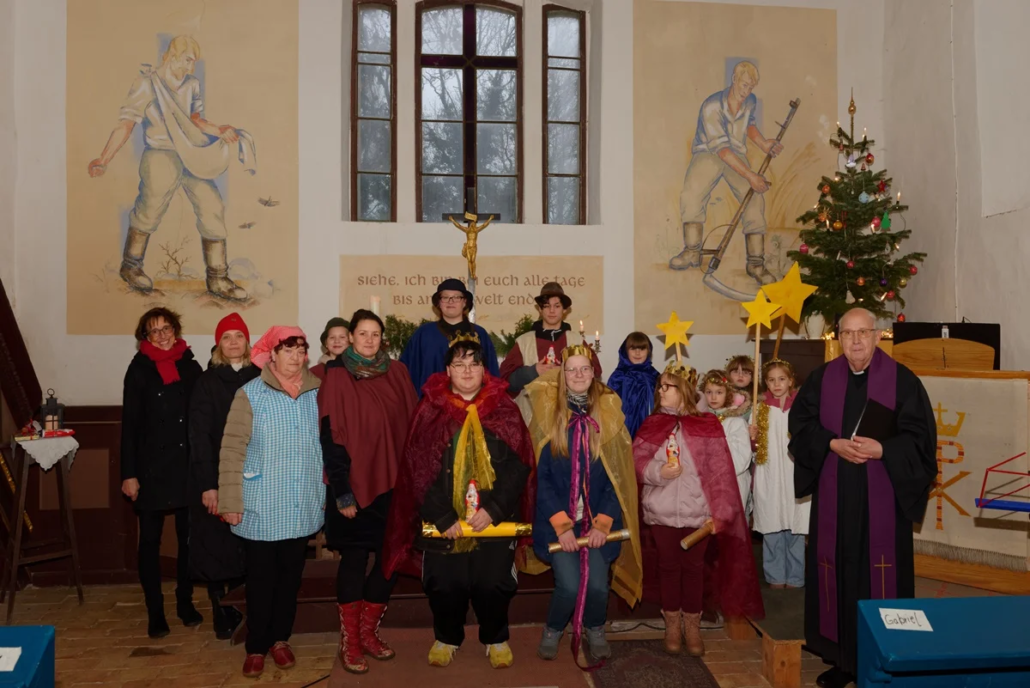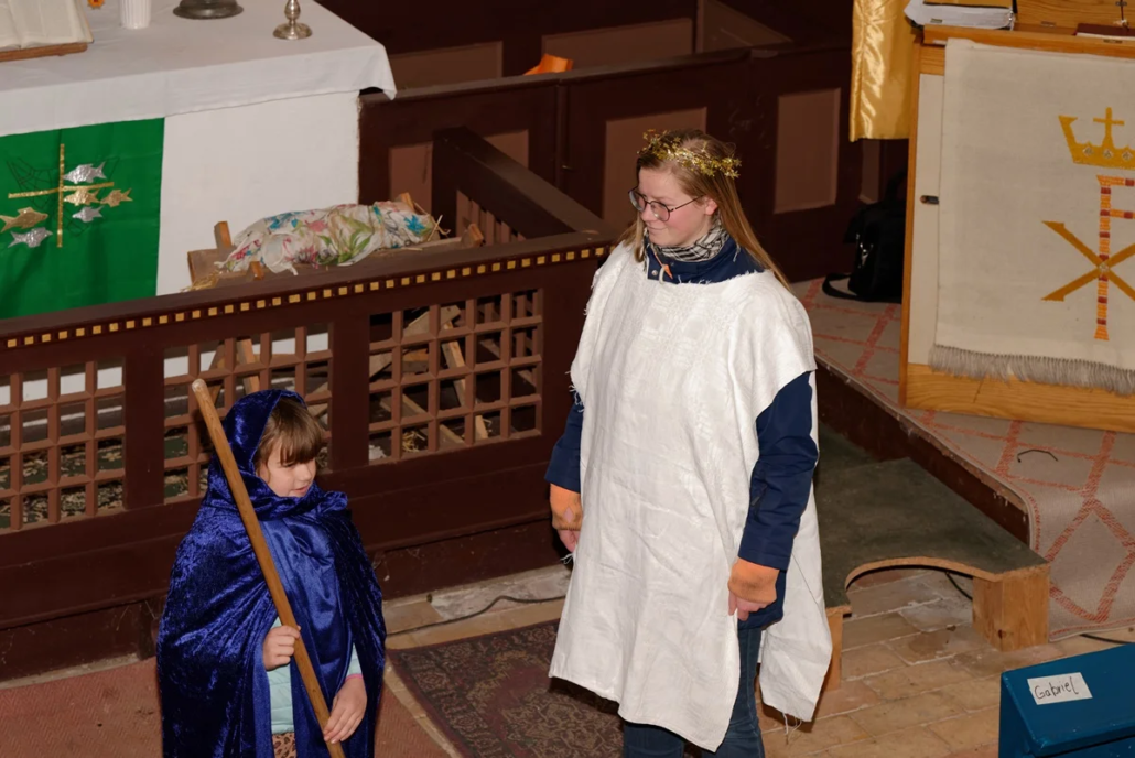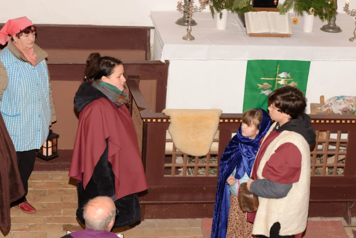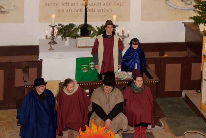 Wie in den vergangenen Jahren standen Menschen aller Generationen gemeinsam auf der „Bühne“. Mit viel Freude und Engagement gestalteten Diana, Lucy, Anna, Amelie, Rosi, Lucas, Carolin, Heike, Emilia, Cosima, Fynn und Josi das Krippenspiel.