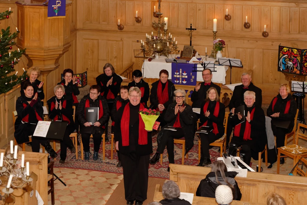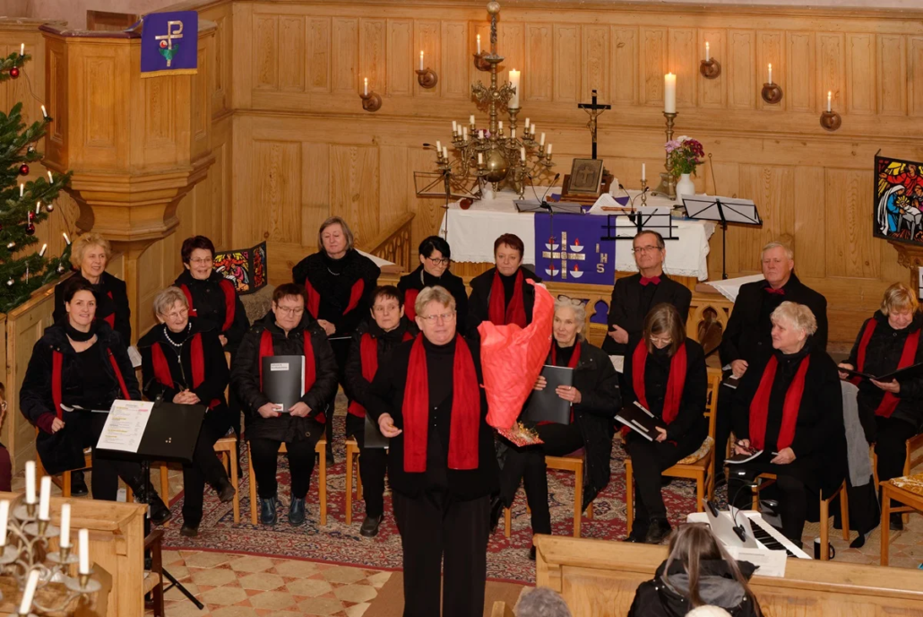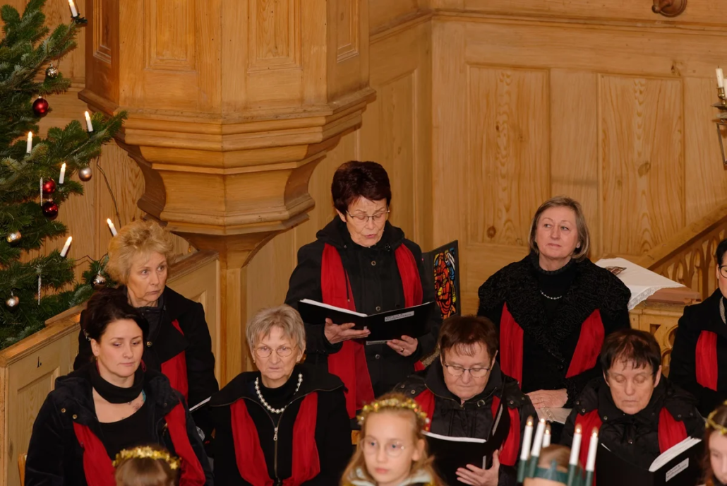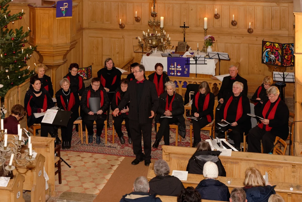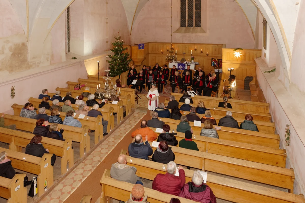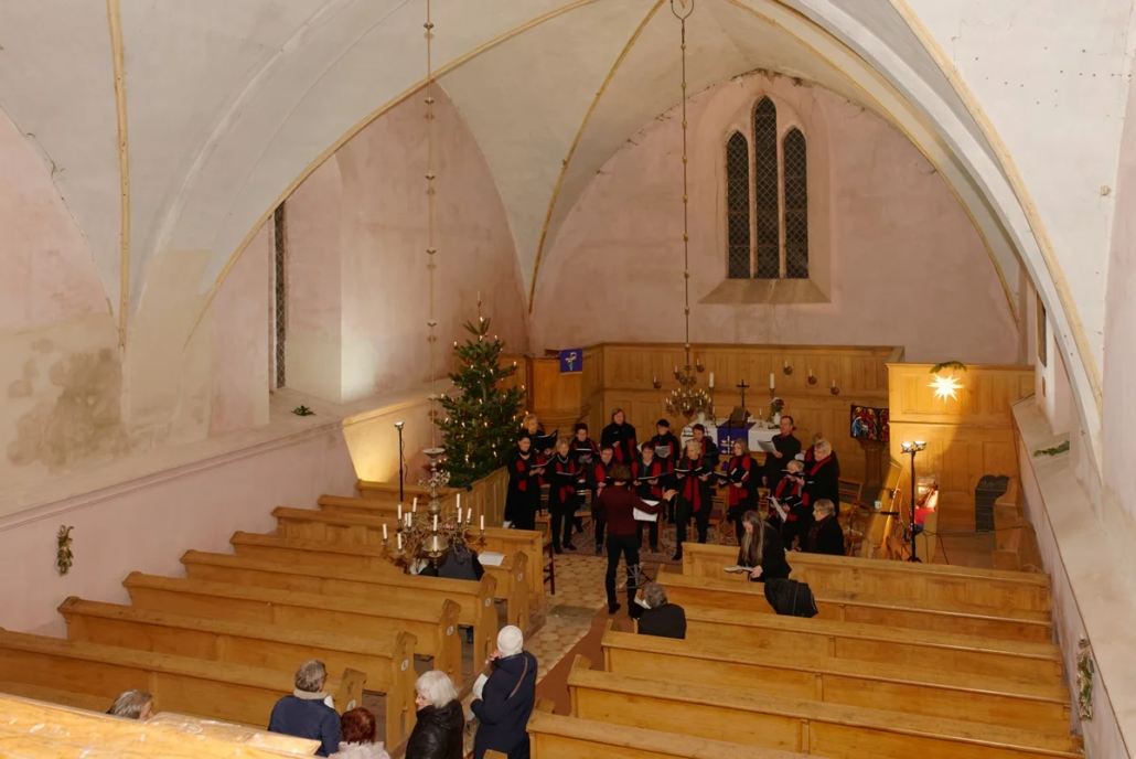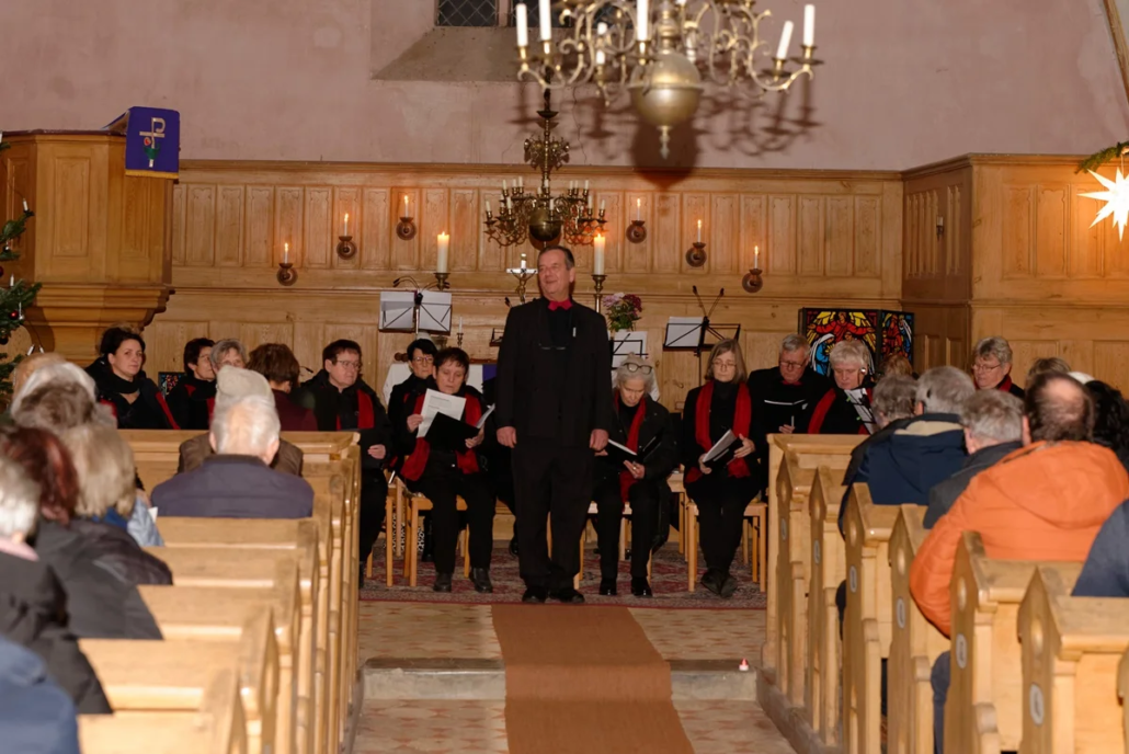 Kaum hatte man das Gotteshaus betreten, öffnete sich der Blick auf das festlich illuminierte Kirchenschiff – und auf den Chor, der bereits beim Einsingen war. Die ersten warmen Klänge begrüßten die Gäste und füllten den Raum mit Vorfreude.