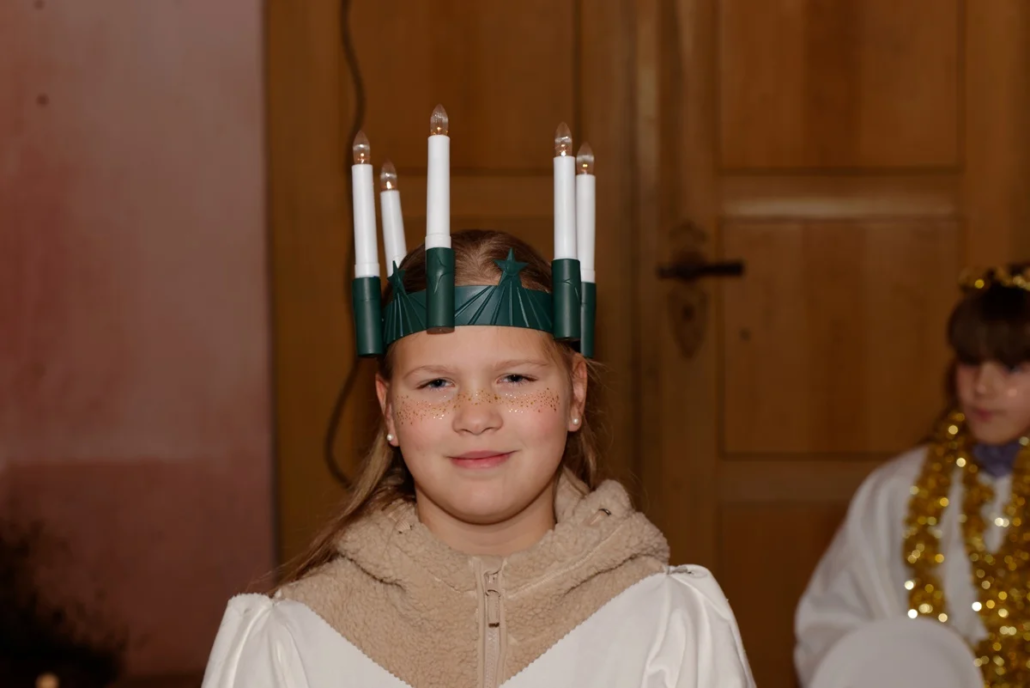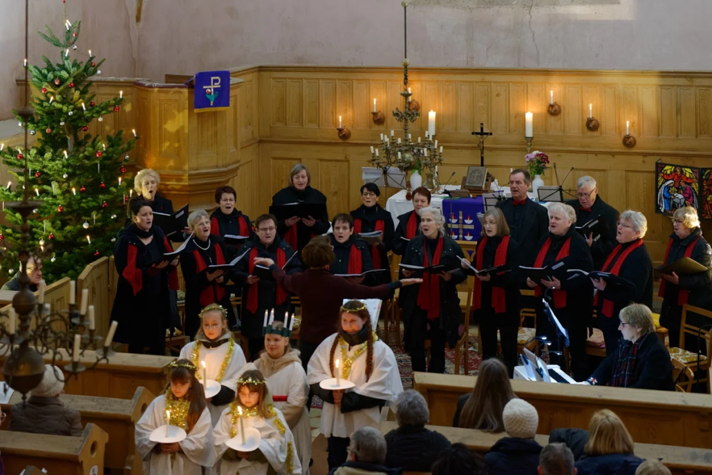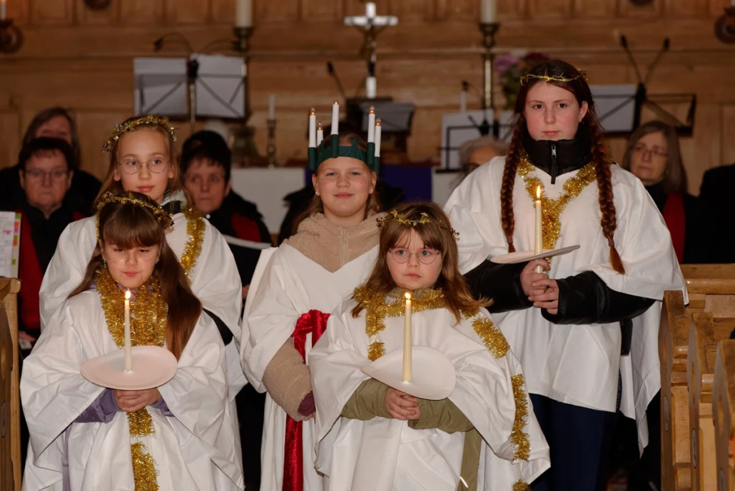 Im warmen Lichterglanz der Lucia führte Maike Marsch durch das Programm, während die Lucia-Kinder feierlich in die Kirche einzogen und gemeinsam mit der umfangreichen Illumination Chor und Kirchenschiff in sanftes Licht tauchten.