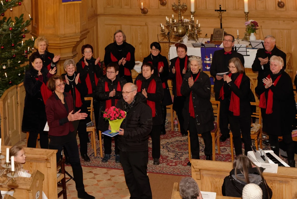 Bevor zu Glühwein, Punsch und Gebäck übergeleitet wurde, ergriff Kathrin Schulz das Wort und dankte Prädikant Burkhard Fröhlich für seine jahrzehntelange, aktive Mitgliedschaft im Kirchenchor.