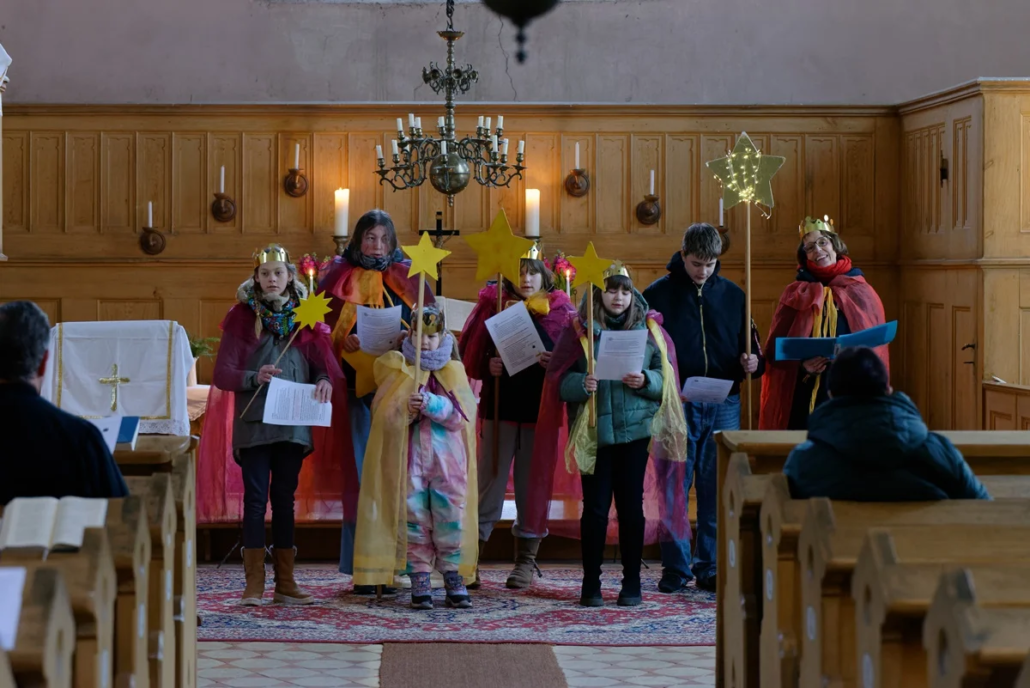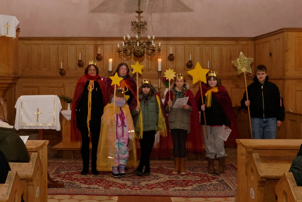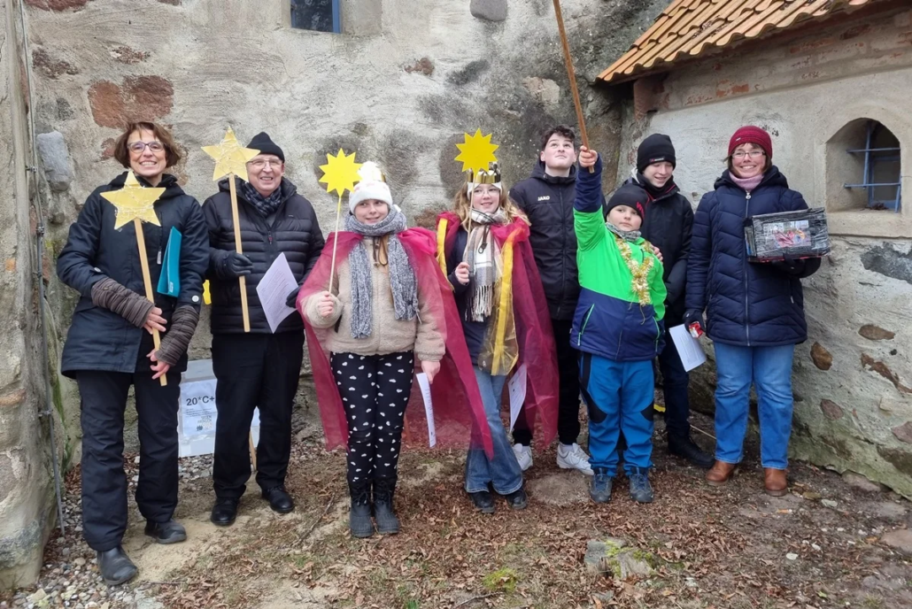 Am Samstag Nachmittag ab 14:30 Uhr war dann vor der Kirche in Iven der Auftritt der Sternsinger. Wieder waren die Häuser symbolisch aufgebaut und die Familien stellten sich dazu. In Iven hatte Kathrin Schulz zusammen mit Prädikant Burkhard Fröhlich und den Sternsingern aus Iven geprobt.
