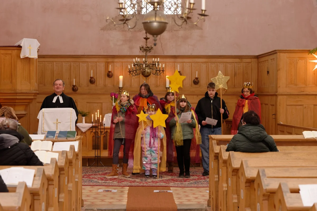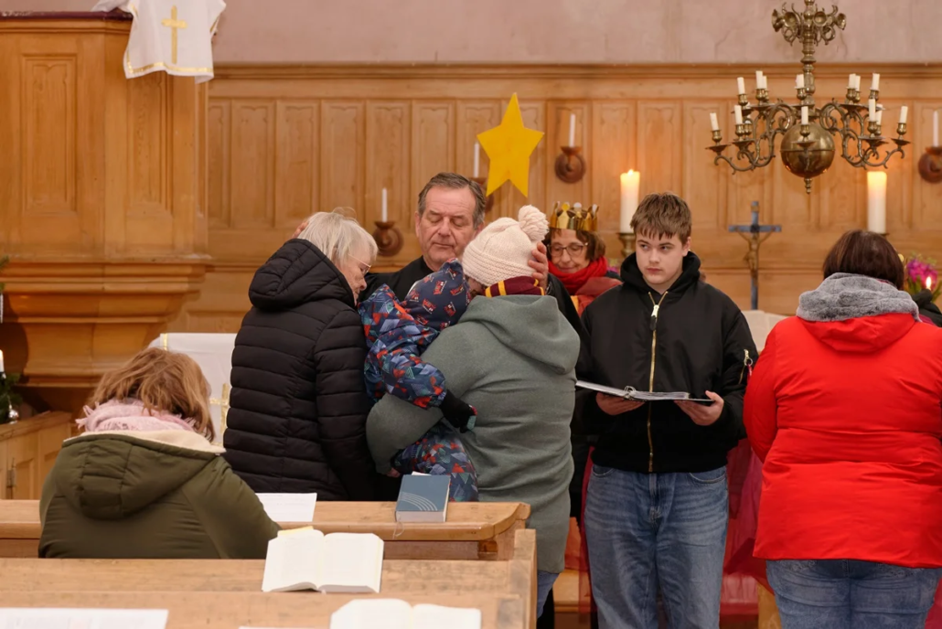 Der erste Auftritt der Sternsinger war am Samstag Morgen um 10:00 Uhr vor der Kirche in Krien. Gemeindepädagogin Kathrin Schulz hatte zusammen mit Pastor Rupert Schröder und den Sternsingern aus Krien den Ablauf eingeübt. Die Häuser der Familien waren symbolisch vor der Kirche aufgebaut und die Familienmitglieder stellten sich dazu. Jede einzelne Familie bekam Lieder gesungen und Pastor Rupert Schröder segnete die Teilnehmer. Den Aufkleber für die Haustür konnte dann jeder Teilnehmer mitnehmen.