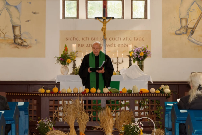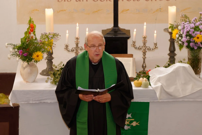 In seiner Predigt widmete sich Burkhard Fröhlich dem Thema des Dankes. Er erinnerte daran, dass eine Ernte keineswegs selbstverständlich ist. Anhand der biblischen Geschichte von der Brotvermehrung zeigte er, dass das, was wir ernten, auch zum Teilen bestimmt ist. Doch gerade in unserer Zeit, so betonte er, wird Bedürftigkeit nur allzu oft von Habgier und Egoismus überschattet. Dabei schenkt das Teilen nicht nur anderen Freude – es lässt auch uns selbst spüren, wie reich wir wirklich sind.