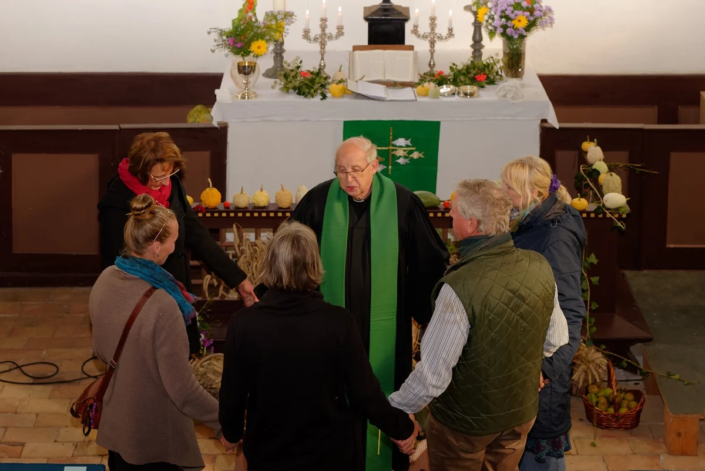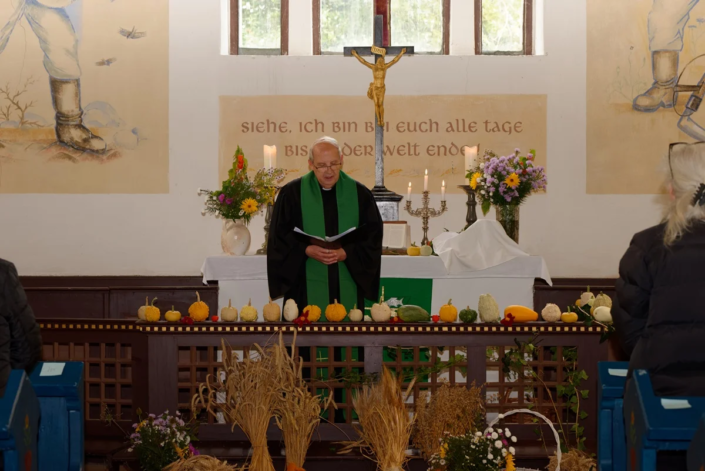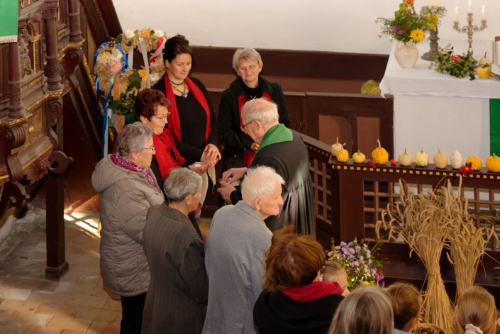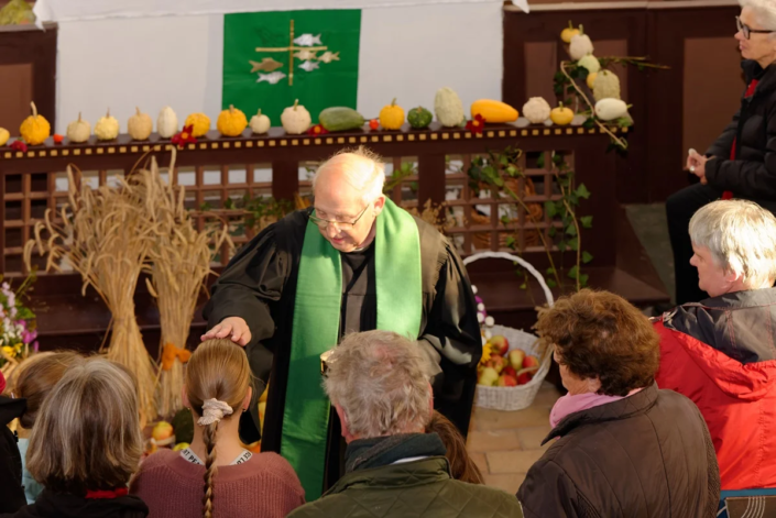 Zum Erntedankfest in Steinmocker waren alle herzlich zum Abendmahl eingeladen, und viele Gemeindemitglieder folgten dieser Einladung. Nach dem Segen gab Burkhard Fröhlich bekannt, dass die Gaben und Spenden rund um den Altar der Anklamer Tafel zugutekommen werden. Im Anschluss lud die Gemeinde zu Kaffee und Kuchen ins gegenüberliegende Gemeindehaus ein – ein gemütlicher Ausklang in fröhlicher Runde.
