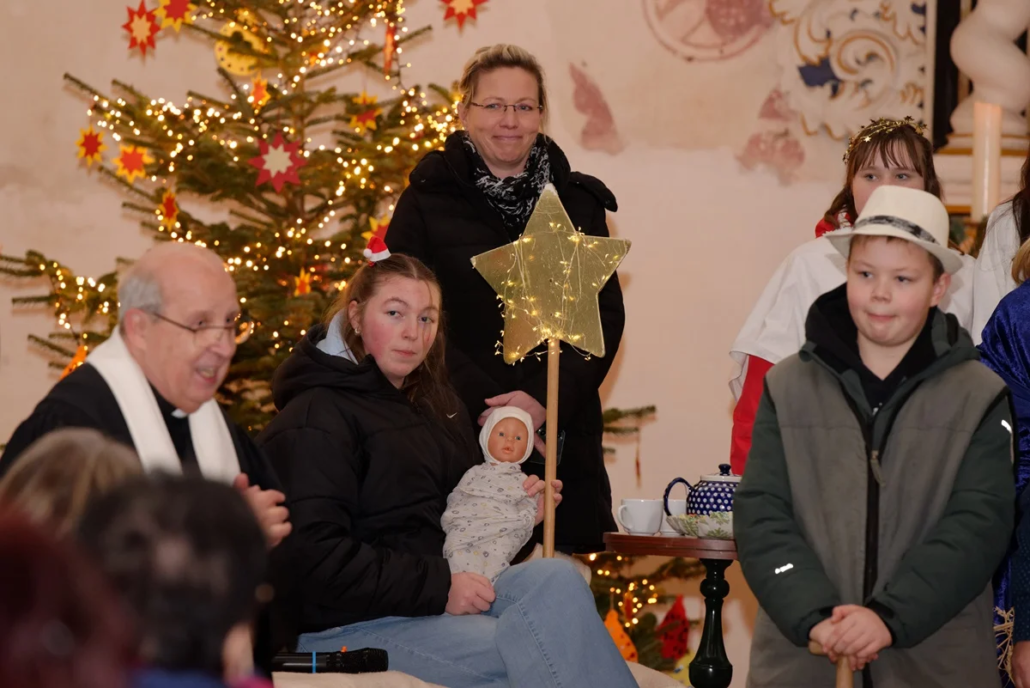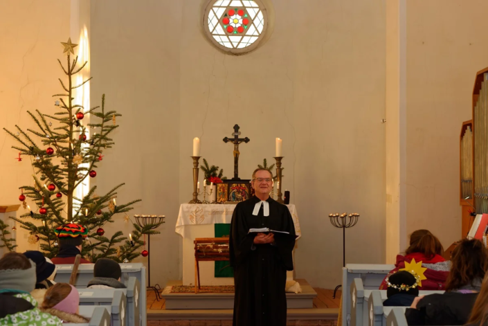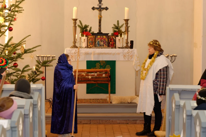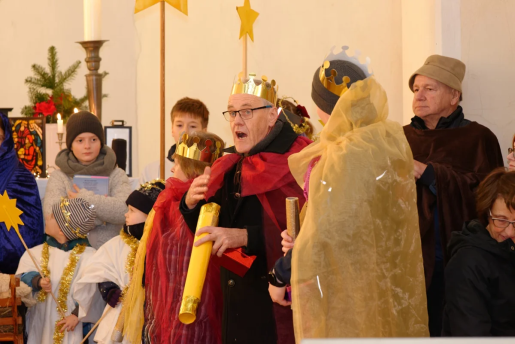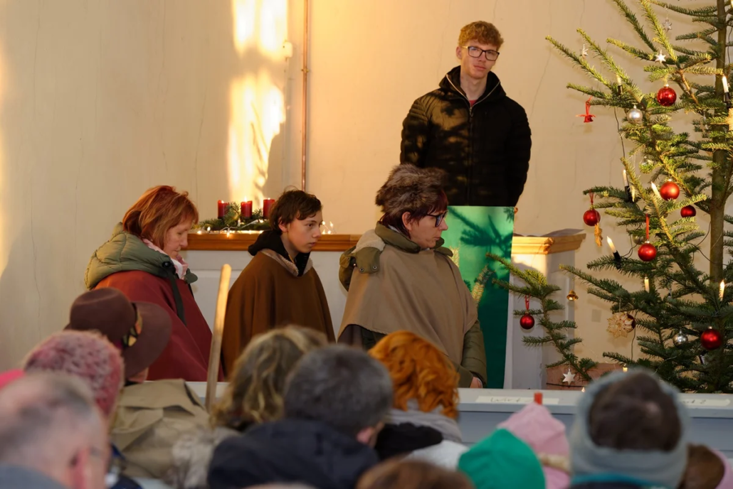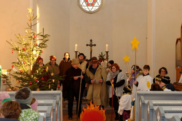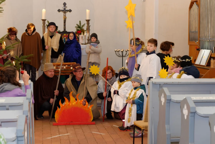 In seiner Predigt erinnerte Prädikant Burkhard Fröhlich an die Geschehnisse in Bethlehem vor über 2.000 Jahren. Er rief zu Frieden und Nächstenliebe auf und schlug damit eine Brücke in die heutige Zeit. Anschließend übergab er das Zepter an die Krippenspielerinnen und Krippenspieler. Für die Inszenierung zeichnete Katrin Bücker verantwortlich.