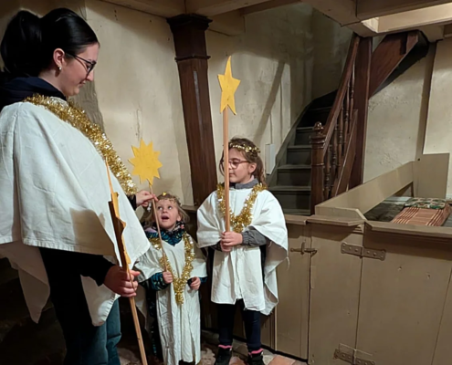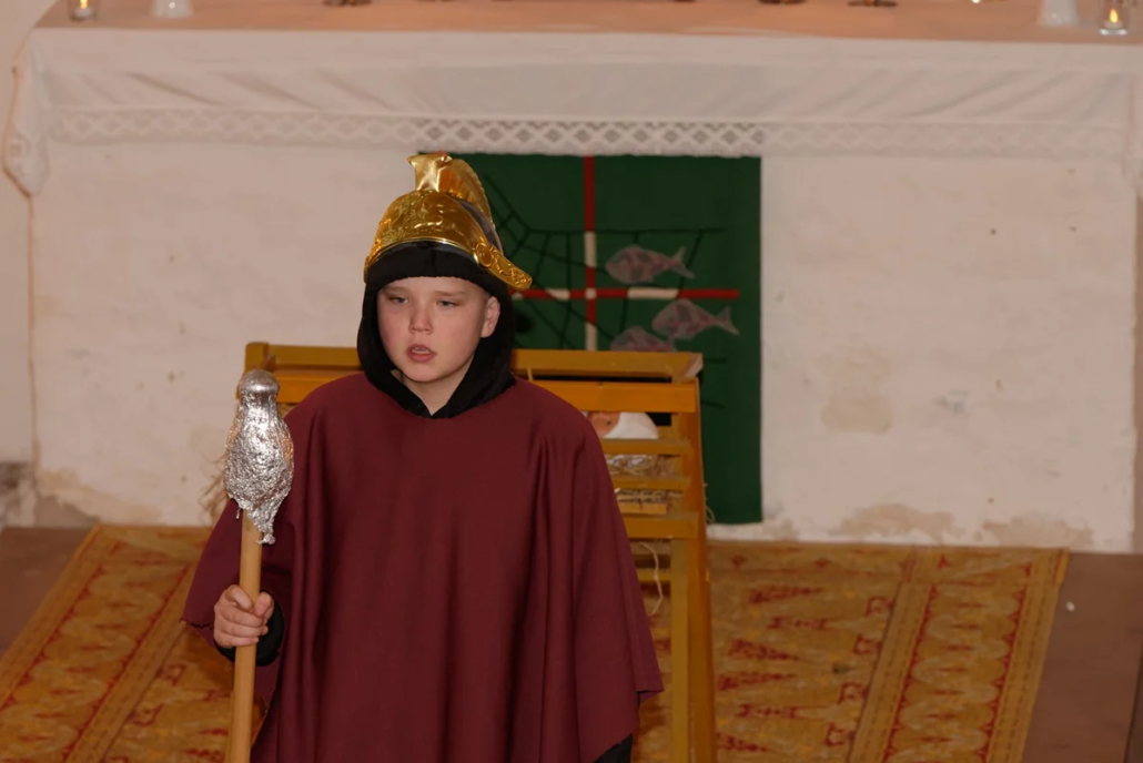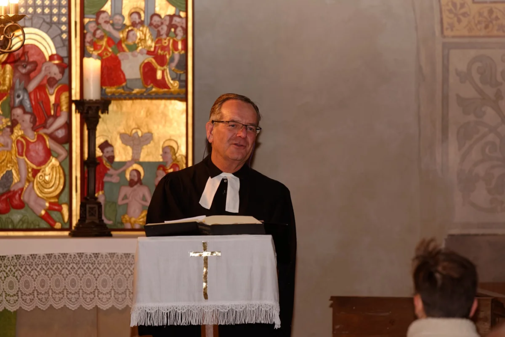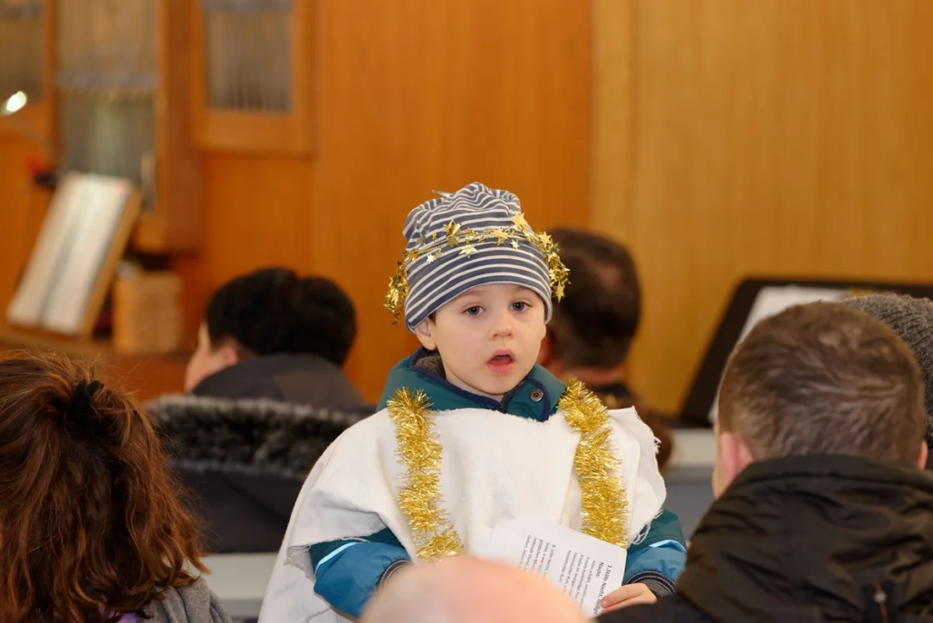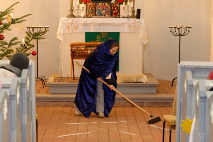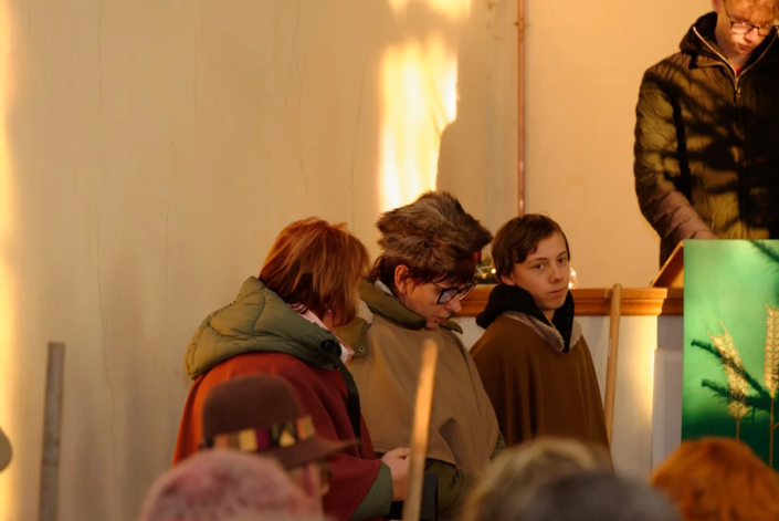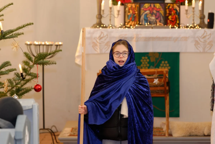 In seiner Predigt erinnerte Prädikant Burkhard Fröhlich an die Geschehnisse in Bethlehem vor über 2.000 Jahren. Er rief zu Frieden und Nächstenliebe auf und schlug damit eine Brücke in die heutige Zeit. Anschließend übergab er das Zepter an die Krippenspielerinnen und Krippenspieler. Für die Inszenierung zeichnete Katrin Bücker verantwortlich.
