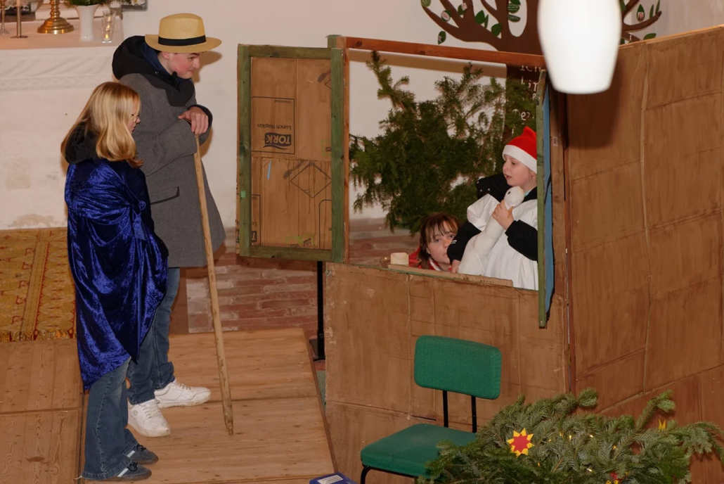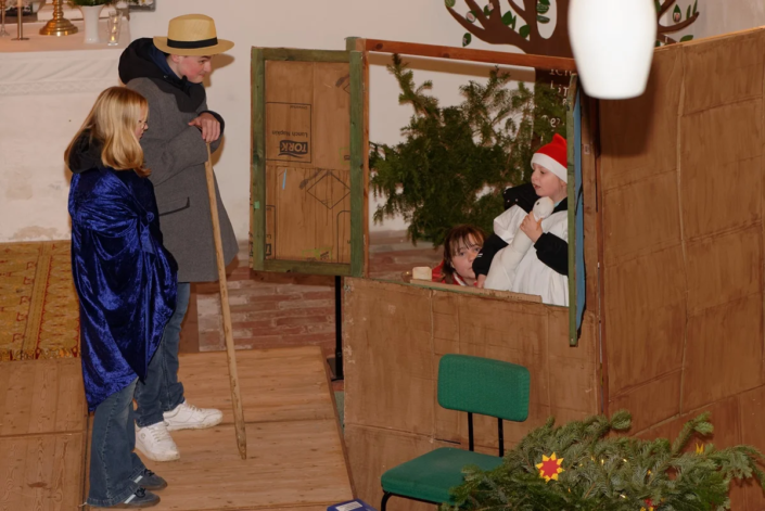 Das traditionelle Krippenspiel, liebevoll inszeniert von Kathrin Schulz, war ein weiterer Höhepunkt des Gottesdienstes. Mitwirkende aus Wegezin waren Ralf, Horst, Doris, David, Birgit, Renate, Maurice,Matteo, Aurelia, Leon, Alina, Tamina, Noah, Jaron, Mara, Celine, Marten, Maika und Ronald. Als Sprecher führte Markus durch das Krippenspiel.