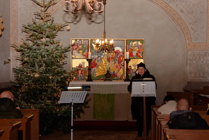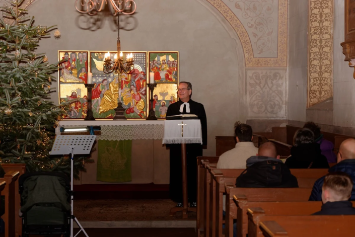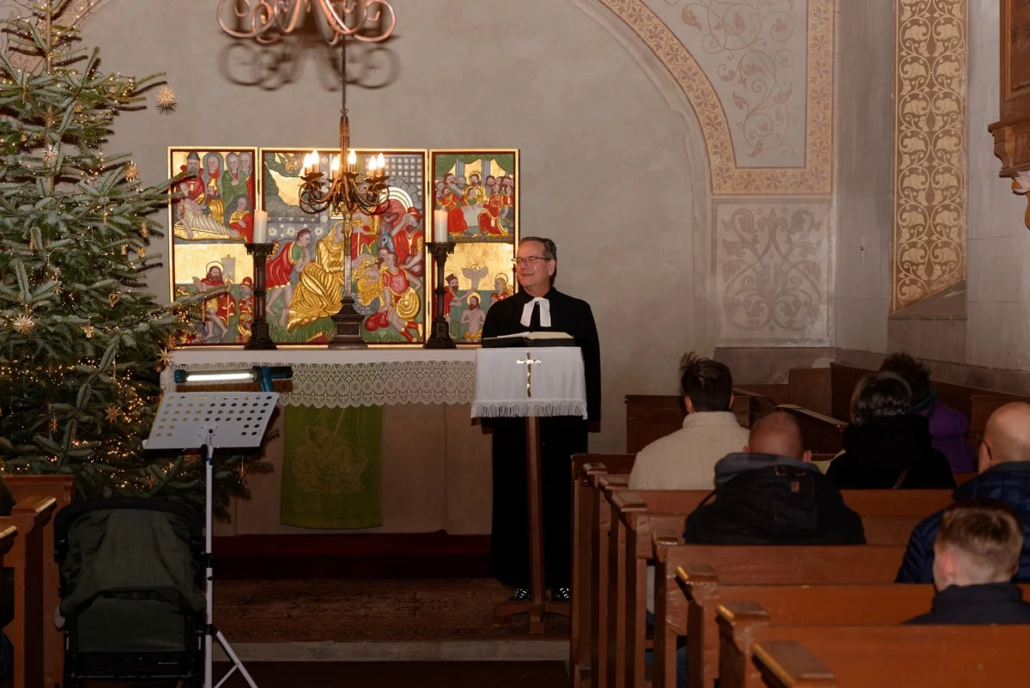 Pastor Rupert Schröder begrüßte die Gemeinde in der sonnendurchfluteten, festlich geschmückten Kirche und erläuterte den Ablauf des Gottesdienstes. In seiner Predigt erinnerte er an die Ereignisse vor 2025 Jahren in Bethlehem und stellte deren Bedeutung für die heutige Zeit heraus. Die traditionellen Kirchenlieder wurden von Kathrin Schulz an der Orgel begleitet.